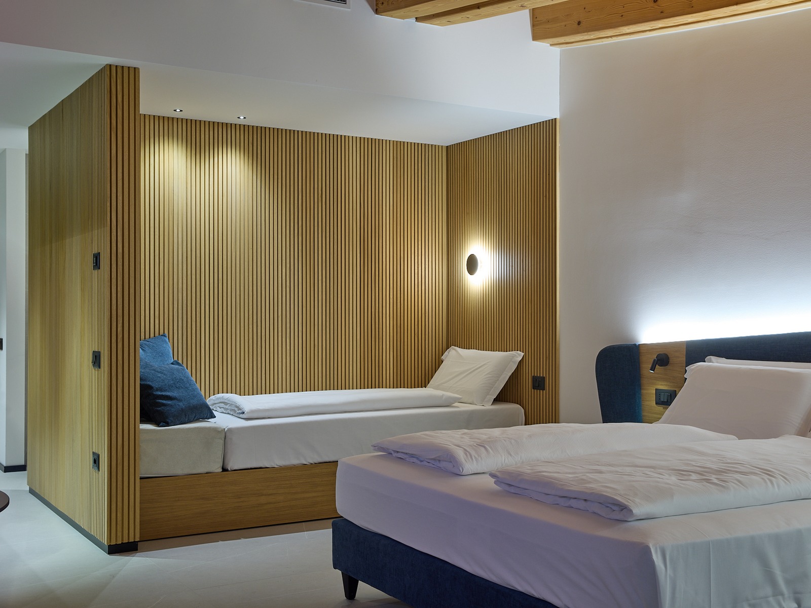 L’intervento sulla nuova ala ha previsto la realizzazione di quattro camere con annessa zona spa, pensate per ampliare l’offerta esistente e intercettare una domanda sensibile al comfort e al benessere. La sfida è stata quella di trovare un fil rouge capace di dialogare con l’identità originaria della struttura, ma allo stesso tempo di proporre un’esperienza alternativa, più intima, immersiva e di valore. Le linee guida progettuali si sono concentrate sulla flessibilità degli spazi, sulla qualità e sul comfort dei dettagli, e sulla continuità visiva: ogni camera è orientata verso l’esterno, in modo che luce e paesaggio diventino parte integrante dell’esperienza.